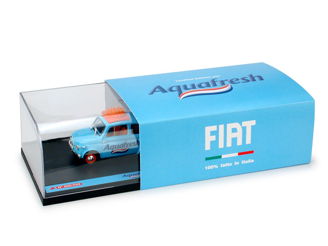Fiat 500 in edizione limitata per il lancio della piattaforma Denti e Lingua Aquafresh "il modellino Fiat 500 Aquafresh si riconosce per l'esclusivo puliscilingua circolare applicato sul tetto; spazzolino e dentifricio non inclusi " |